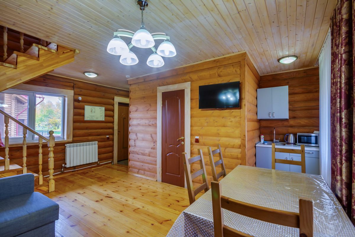 Первый этаж: прихожая, кухня-столовая (кухонный гарнитур, холодильник, микроволновая печь, эл. чайник, посуда), гостиная (раскладыващийся мягкий диван, телевизор), 1 с/узел